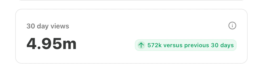At home tomorrow, I’ll dive back into frantic graduation preparation leading up to Arlo’s big day this Thursday. In the meantime, I want to acknowledge new promising analytics: The fact that this newsletter has jumped from 1.2 monthly views to just under 5 million in recent weeks! Unexpectedly, the political pivot seems to be popular and not slowing down anytime soon. I can’t thank you enough for sticking with me. I know many of you landed here for different reasons, driven by varying interests, and as the focus shifts often. I’m grateful for your trust in these detours.