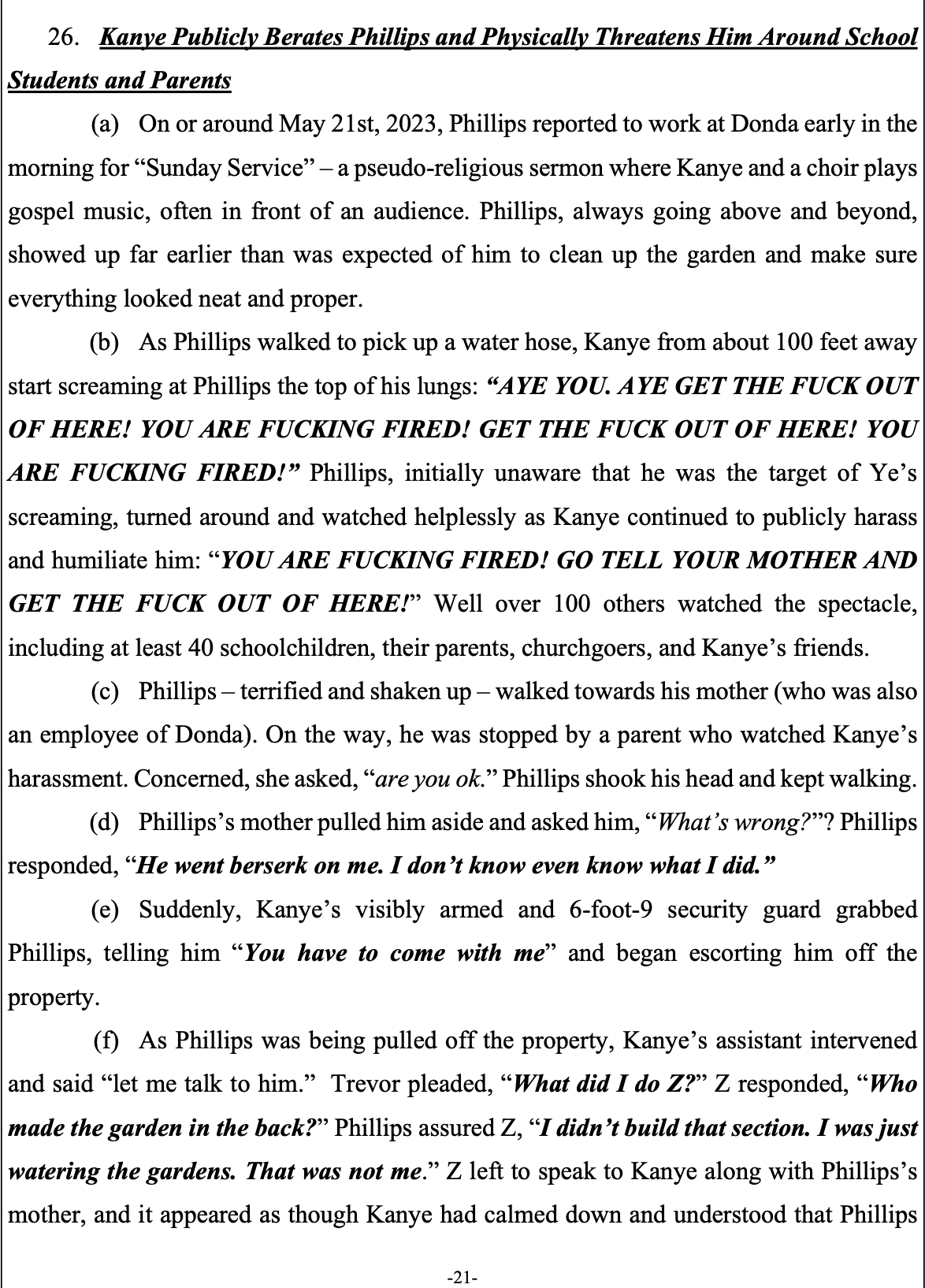 The lawsuit describes Trevor minding his own business, watering the plants that morning, when he suddenly heard Ye screaming on top of his lungs, “AYE YOU GET THE FUCK OUT OF HERE! YOU ARE FUCKING FIRED!”