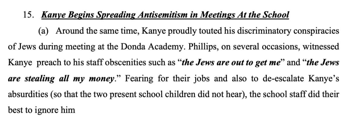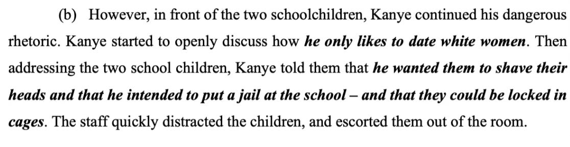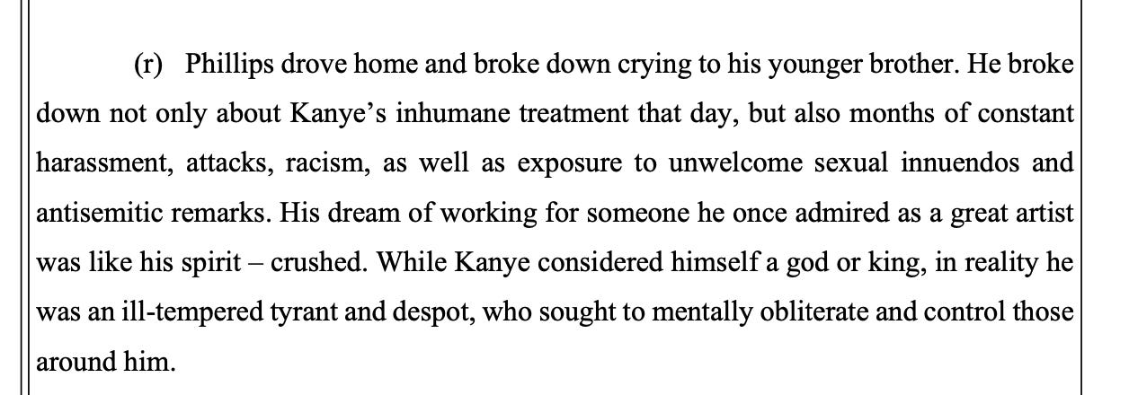 Reading the court documents, I was especially appalled by one of the claims Phillips made, alleging that Ye made fun of a visible growth on his neck and threatened to punch him. Phillips claims Ye got close to his face and screamed, “FUCK YOU!” “FUCK YOUR NECK! and “FUCK YOUR DAUGHTER!” Phillips’ daughter was a student at Donda Academy at the time.