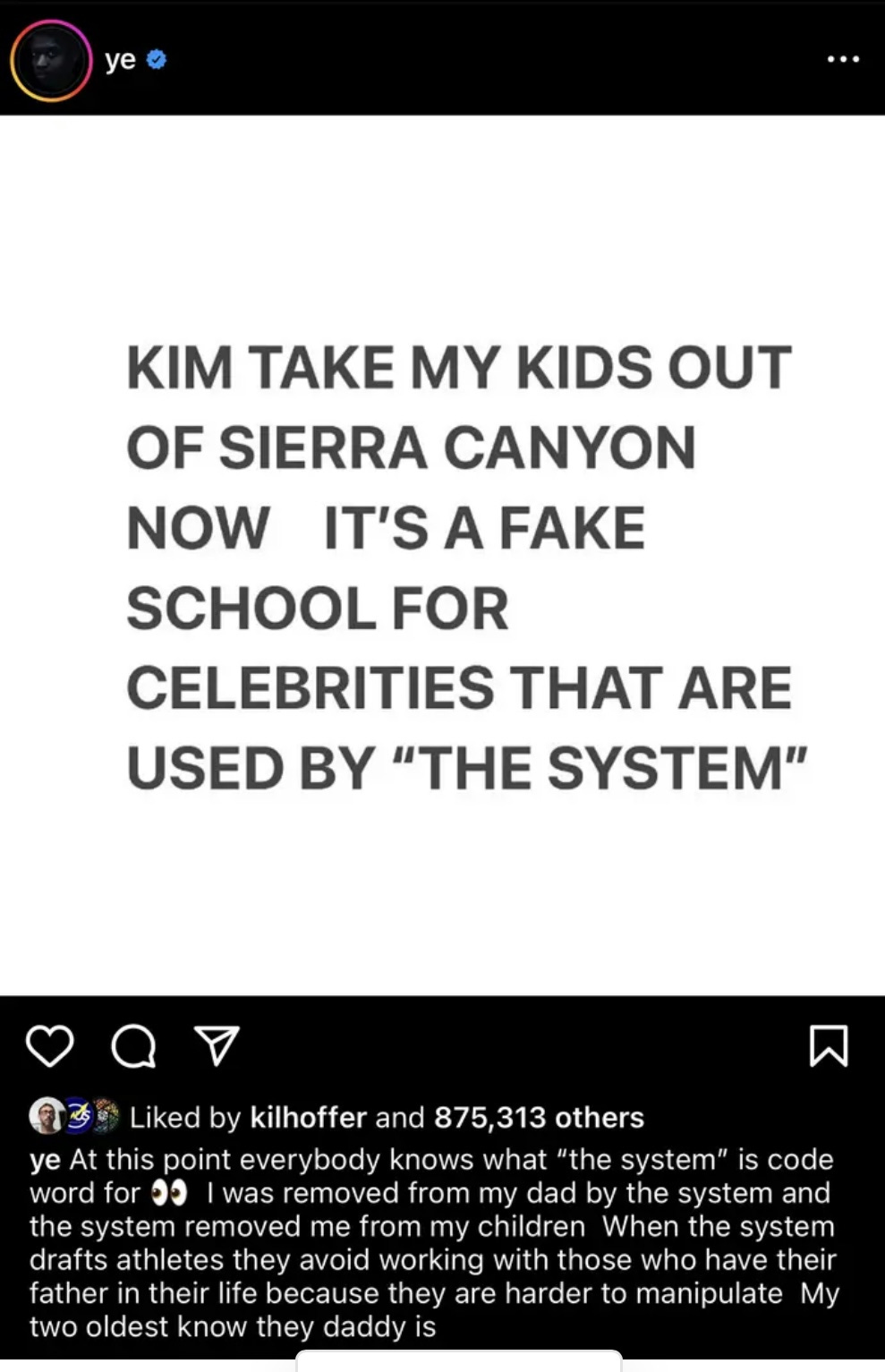 “KIM TAKE MY KIDS OUT. OF SIERRA CANYON NOW IT’S A FAKE SCHOOL FOR CELEBRITIES THAT ARE USED BY THE ‘SYSTEM,’” he posted on Instagram a month ago. His caption read, “At this point everybody knows what ‘the system’ is code word for,” putting ‘the system’ in quotes. Obviously, people assumed he was talking about Jewish people again, despite his public apology to the Jewish community written in Hebrew months prior.