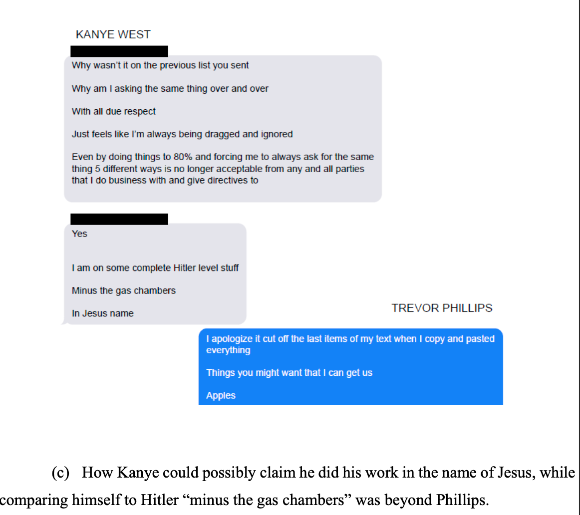 Ye says he’s “I am on some complete Hitler level stuff, Minus the gas chambers, in Jesus name” in a text exchange to Phillips, and expects everyone to agree with his views