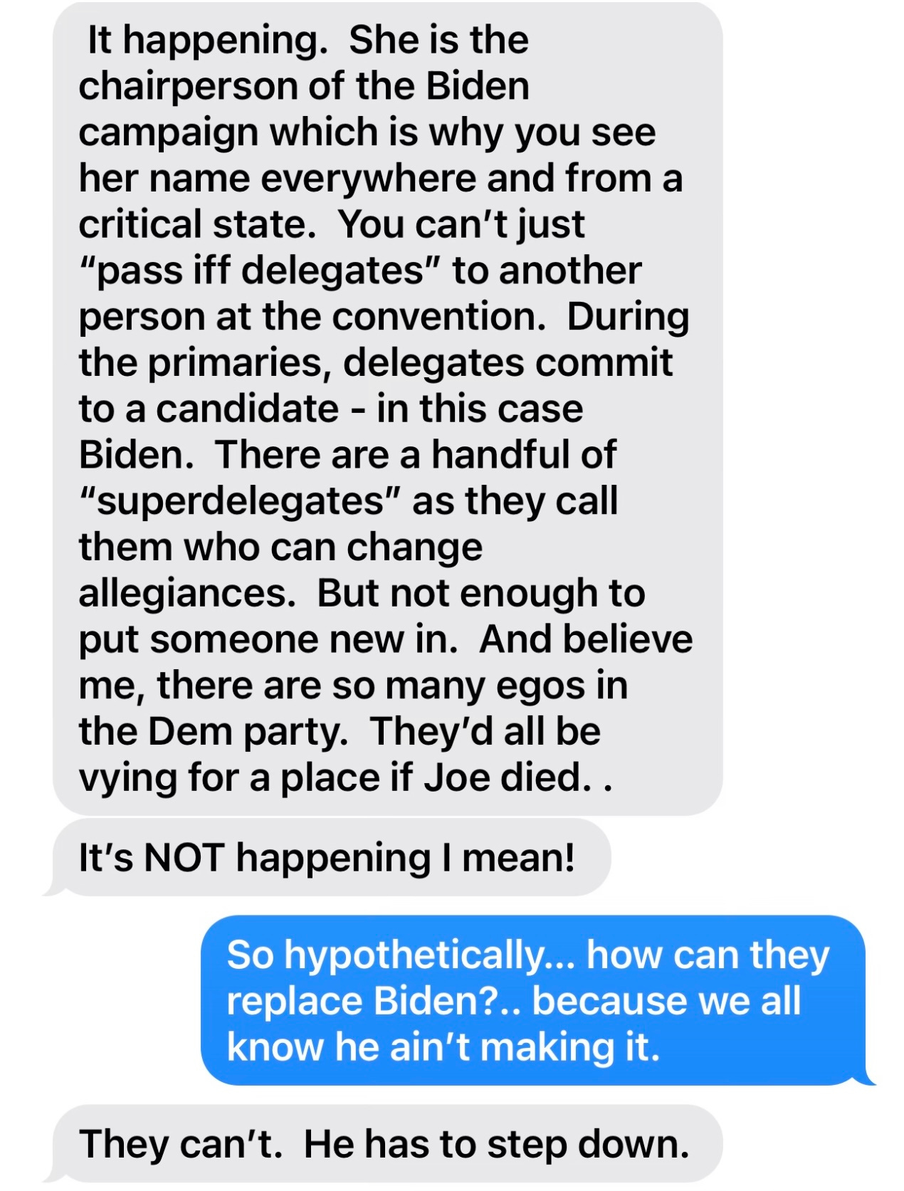 She reiterated her reasons for reaching out in the first place: She had a reaction to it, plain and simple. It struck her as poor form to pull something like this: a deeply thought out political strategy dressed as a last-minute, health-induced switcheroo. Despite being legal and allowed (and, again, pretty savvy), it’s dirty politics if the DNC privately knows they are going to do this but still plan on publicly touting Biden right up to the convention. “I of course understand why, but it’s still shady.”