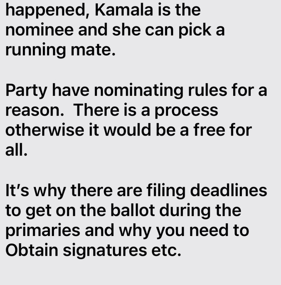 But during the convention, the DNC (or RNC!) is allowed to swap someone in and/or reject the nominee (most typically decided upon by who wins the primary). Technically, this is the place where the collective can change their mind about an individual nominee, for whatever reason: There could be a coup, someone could resign – anything!