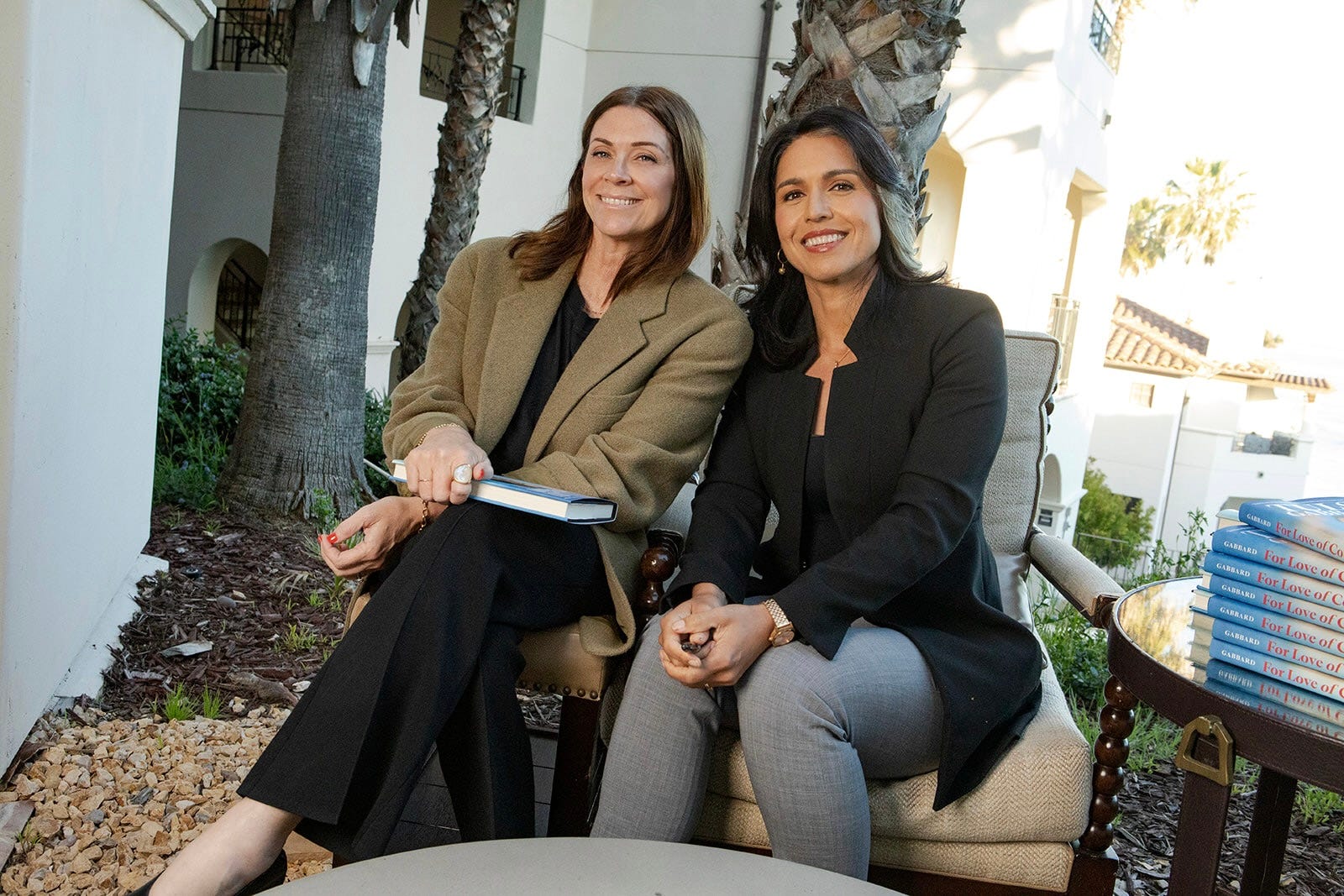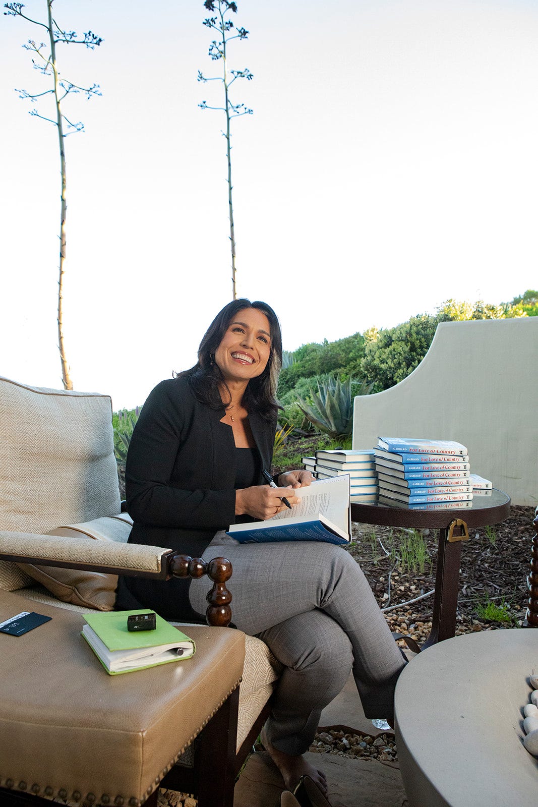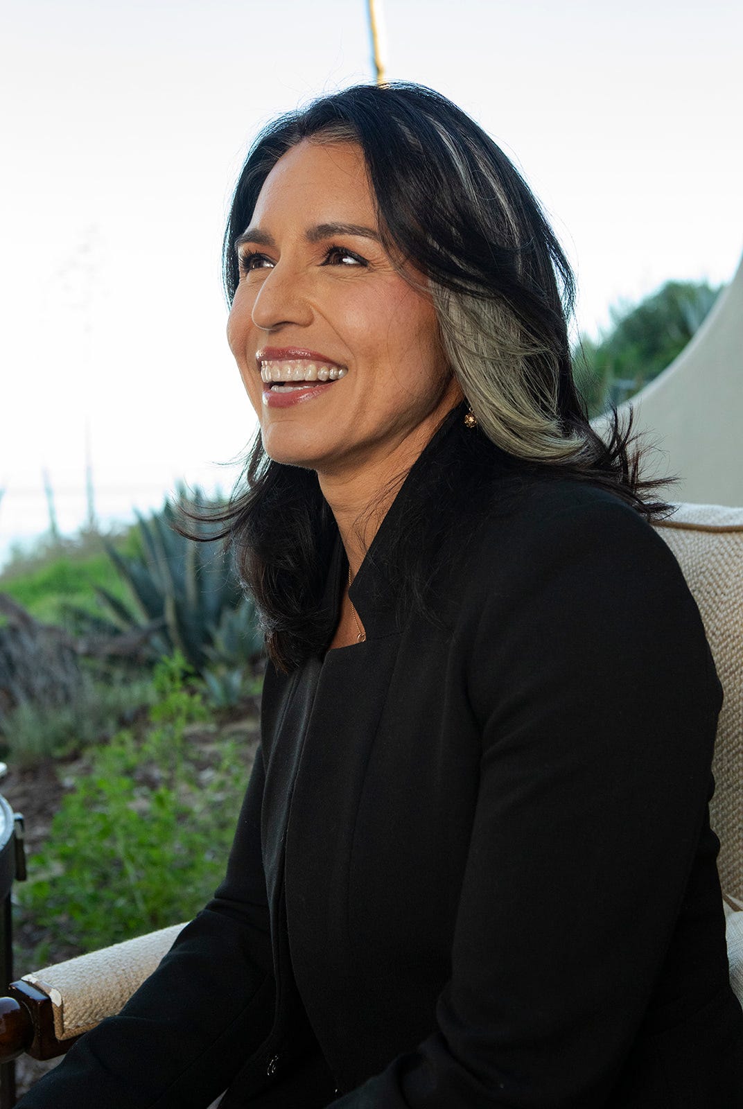 We set up on the patio overlooking a sweeping blue Santa Barbara coastline. She arrived straight from another appearance in makeup she had done herself. I learned later that this is always the case with Tulsi. Turns out the woman is self-sufficient, even when it comes to perfecting her own contouring.