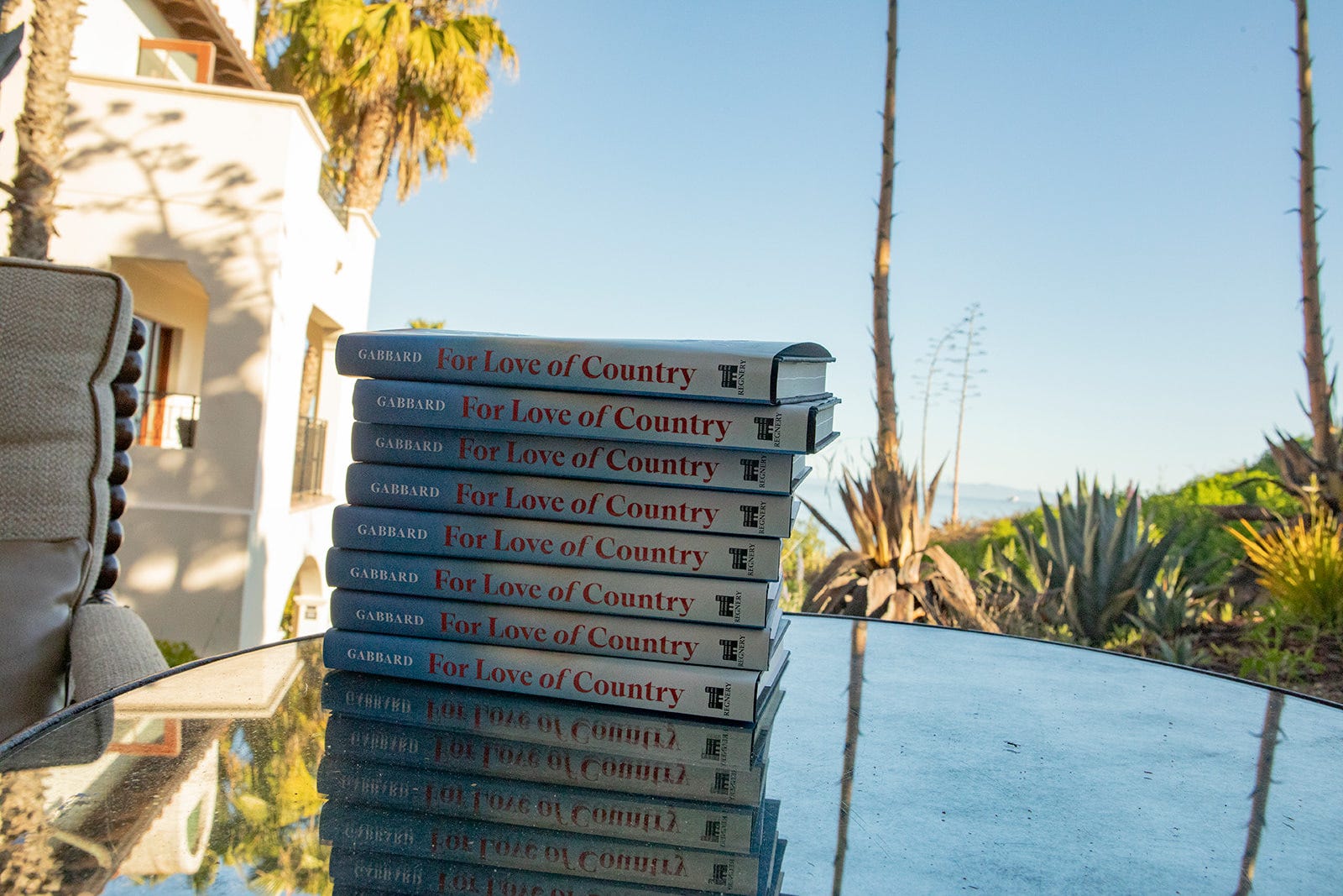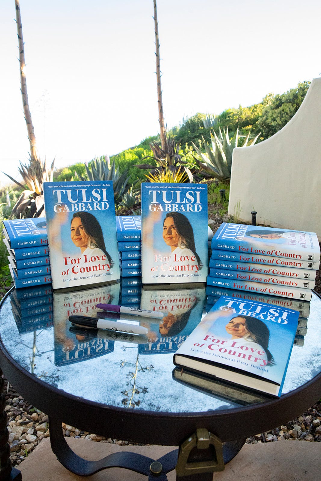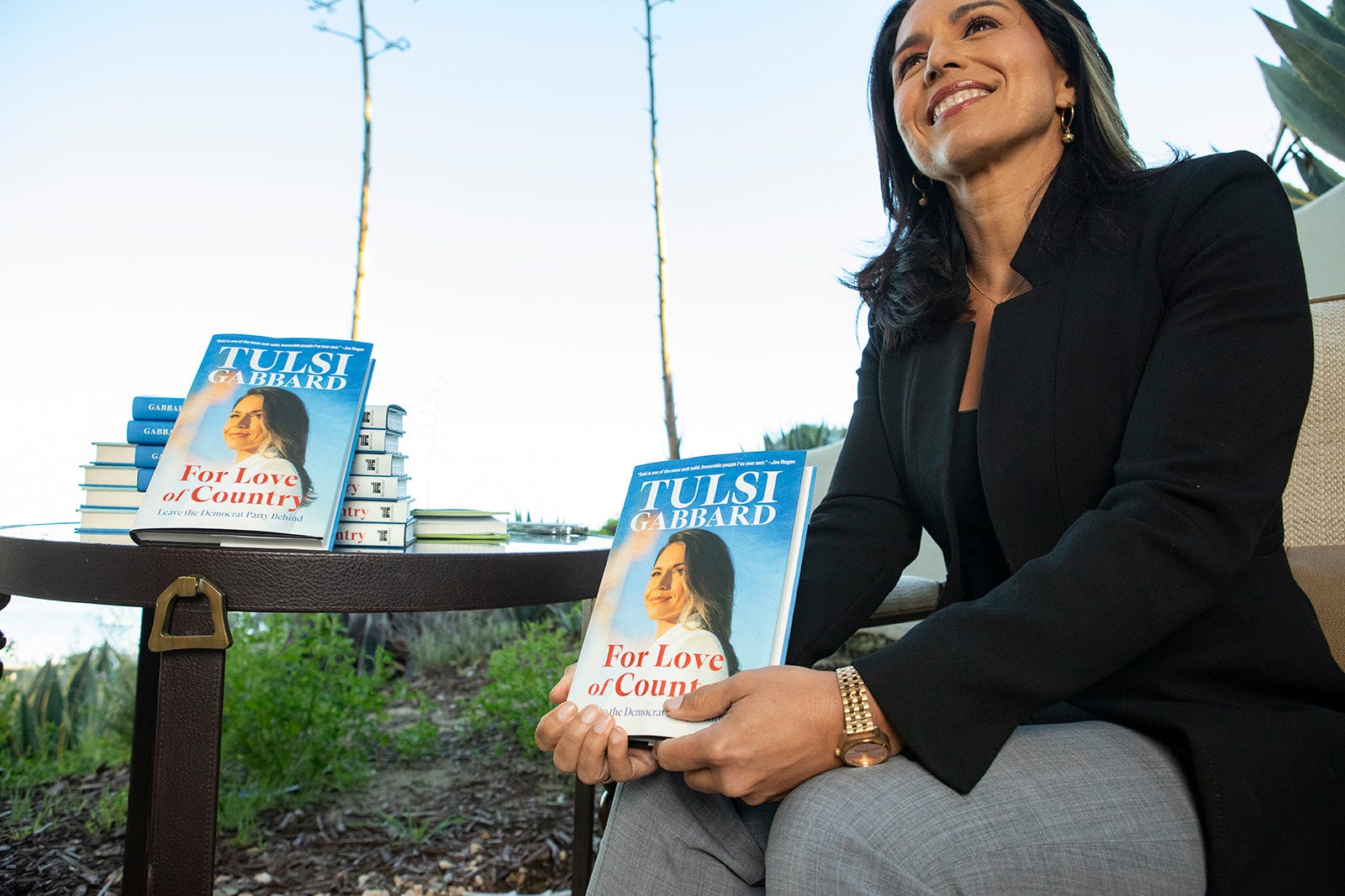 We set up on the patio overlooking a sweeping blue Santa Barbara coastline. She arrived straight from another appearance in makeup she had done herself. I learned later that this is always the case with Tulsi. Turns out the woman is self-sufficient, even when it comes to perfecting her own contouring.