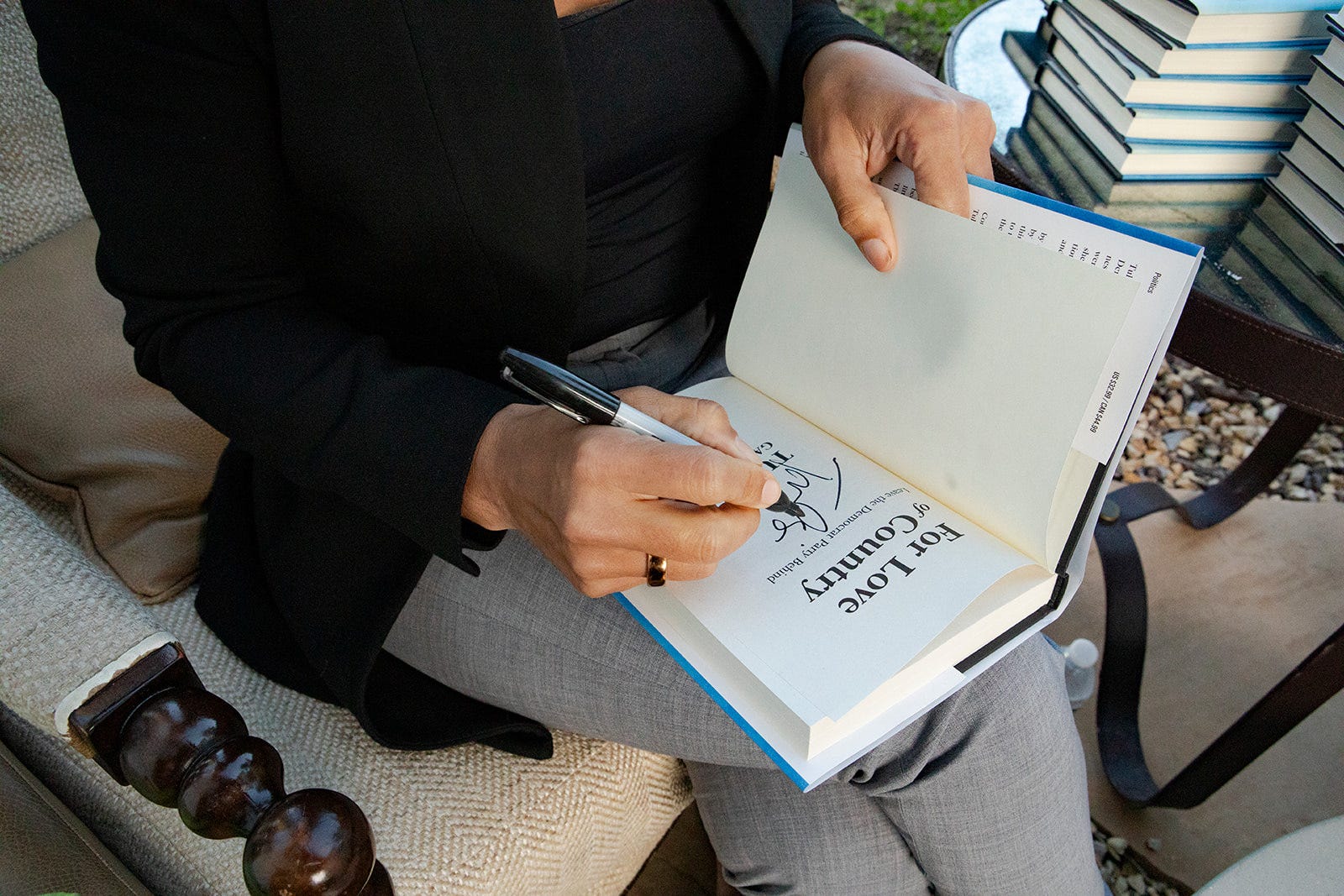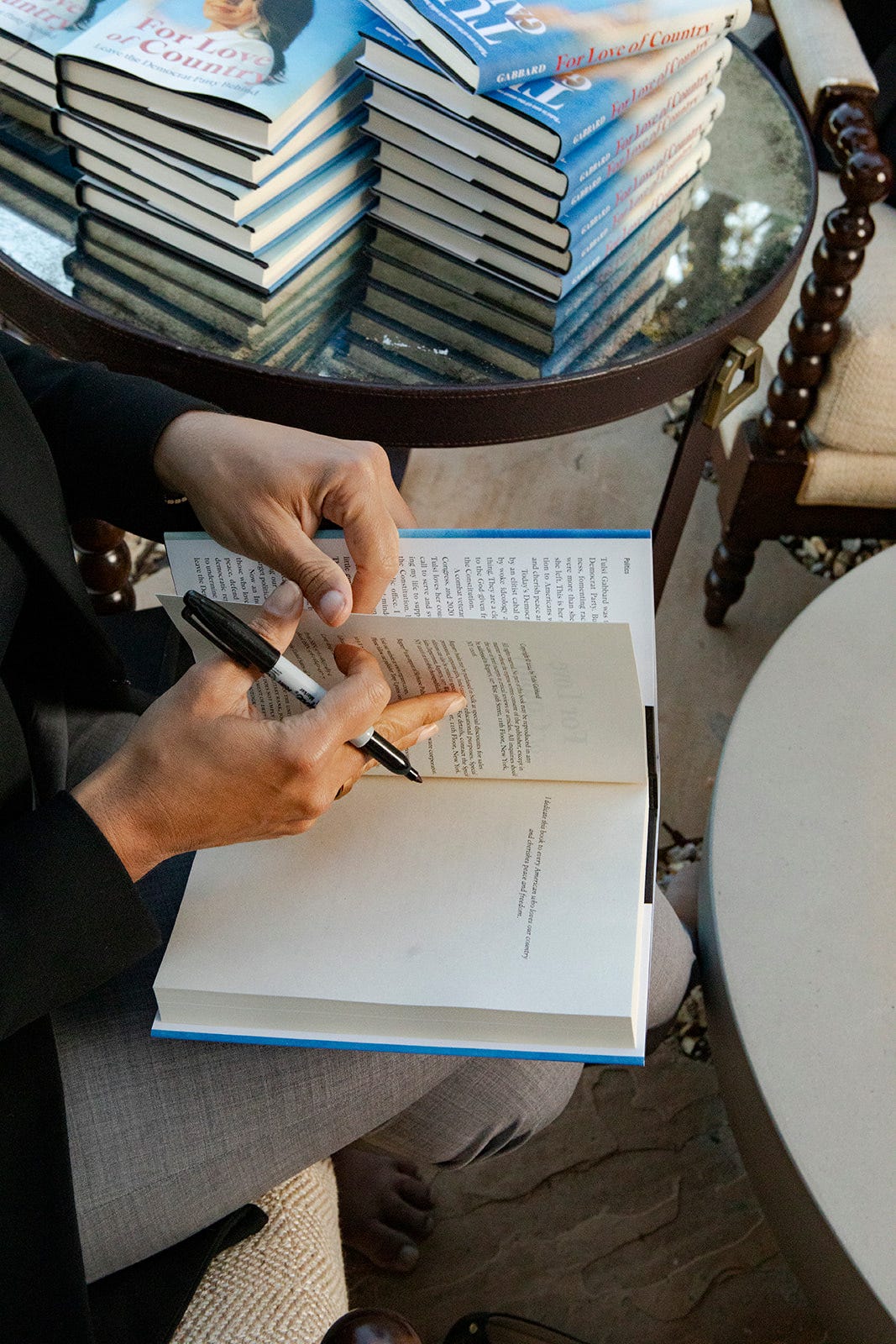 This time around, our backdrop was another casual coastal meet-up. I was on hand to ask questions submitted by those who purchased a signed copy of her book. When we pulled up to the hotel, the valet attendant asked what we were there for. I mentioned Tulsi; he took my keys and smiled. “In that case, your parking is free. I love her!”