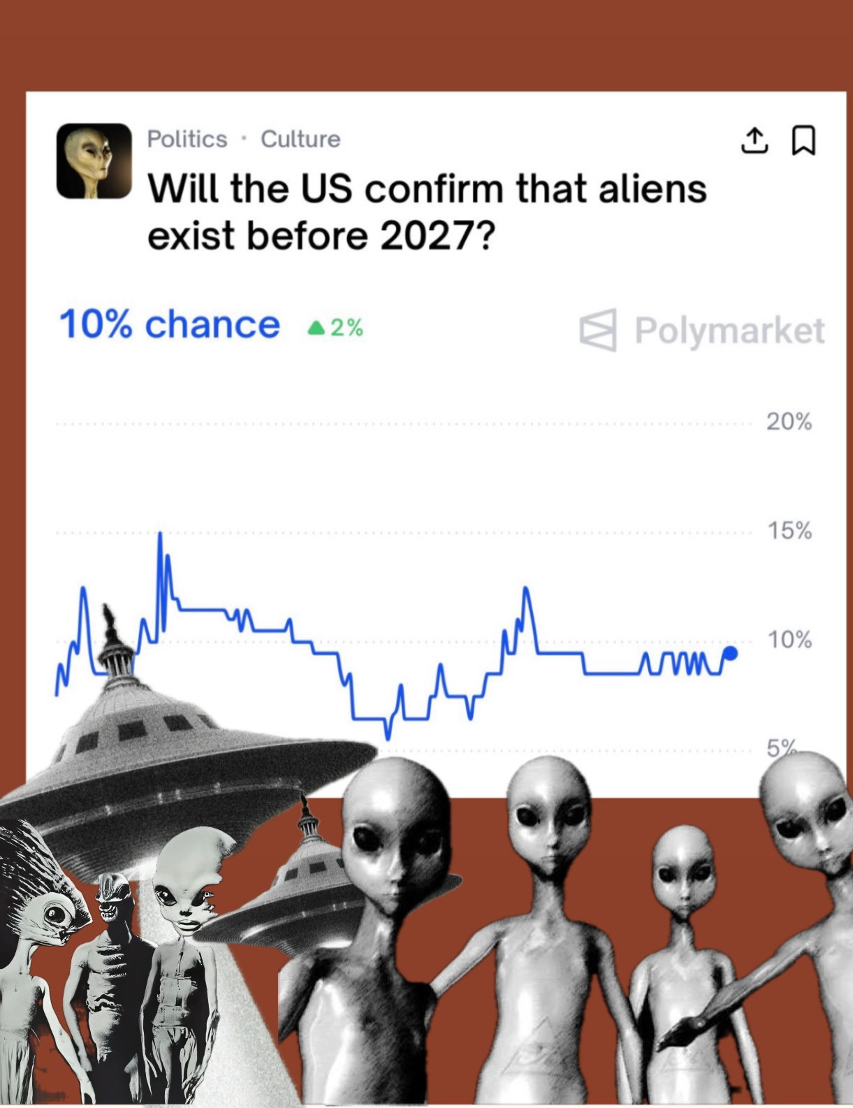 This took me by surprise! Polymarket has the odds at just 10% that the U.S. confirms alien life before 2027. While Congress is holding UAP hearings and officials are hinting at increased transparency, the market isn’t fully buying imminent disclosure.