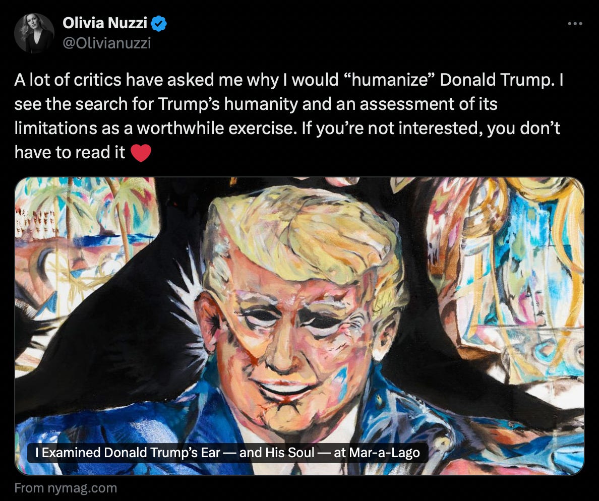 He faced his mortality when he had Covid during his presidency. I remember an adviser he spoke with while he was hospitalized called me to tell me he’d told them, “I could be one of the diers.” I’d never heard that term before, diers. Autocorrect doesn’t even recognize it as a legitimate word, though it is a dictionary standard. One of his brothers had died right around that time. It was a heavy moment, personally and for his presidency. But where he seemed animated by fear then, he strikes me as animated by awe now. I always figured he did not like to think much about God because to submit to God would mean giving up the story he had always told himself about his own extraordinary power, but if God can be accessed through a story in which God is a party to his extraordinary power and in fact God is so clearly on his side that He would intervene to save his life…that is an easier way for Trump to process the idea of God. He cannot explain the series of small decisions that led to his survival on his own. He is amazed and mystified by it. Why did he bring up that data at that moment, why did he ask for that chart to be projected onscreen so early in the rally when he almost never brings up the chart at all, and when he does, he brings it up towards the end? Why, why, why, why? It all amounts to a compelling case for the existence of God, as he tells it. I think it’s really quite amazing to observe someone of his age evolve in such a profound way. It’s one of the most interesting things I’ve ever seen.