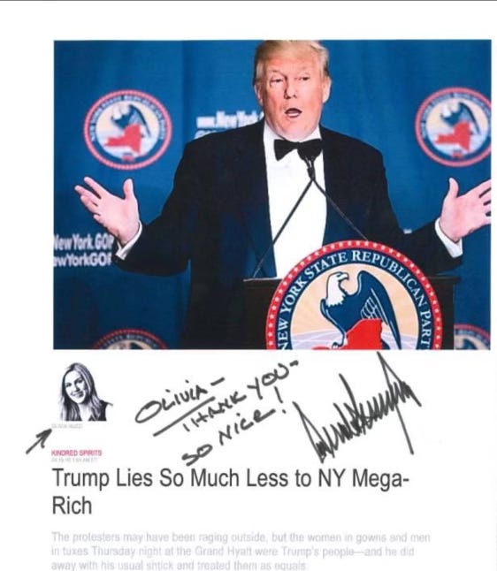 I would love to know. If he is an avid reader, that’s a very well guarded secret. His aides bring him news clips about himself, always printed out, and he reads the Post everyday. Beyond that, it’s a mystery to me. It used to be the case that when you wrote about him he would send you a signed copy of your own article afterwards. I have one of those from early on. The headline was very rude — I was working at the Daily Beast at the time and the publication’s general position was that he could go fuck himself — so he drew an arrow to my author photo and wrote “SO NICE!” lest I get confused and think he meant the story, not me, was nice. When he said during the debate that he had never read the hundreds of pages of materials put together by Heritage about Project 2025, I am confident he was telling the truth.