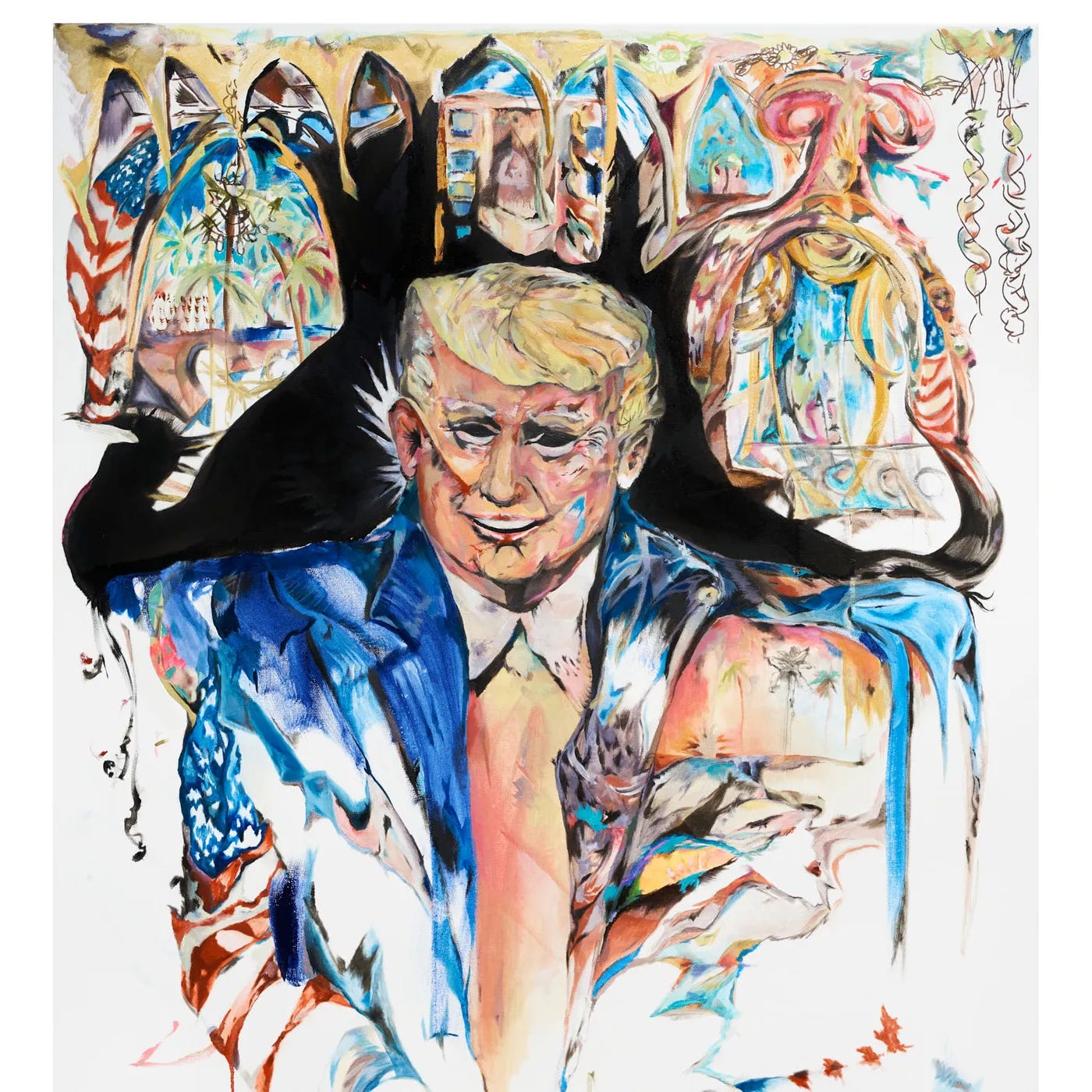 He liked it. He had a few qualms initially, but I was open to dialoguing with him to establish trust. I said this before, but I never intend on creating something with a finished conclusion in mind. The painting starts as an investigation; I am honestly responding to what I see, feel, hear, trip over. His insights are just more honest energy to play with while I build him. I gave him a smile, because he insisted he was a happy guy. That smile tipped me into the direction of the black eyes, and then as I continued to find balance between charisma and stateliness, an existential question emerged in the form of Donald Trump. I have not spoken to him since the painting was published. I finished it in my apartment in New York while Olivia wrote on the floor and let it loom over her. We immersed ourselves in our project; it was blissful and horrifying. He told us that he accepted our pitch because he is competitive and he doesn’t think Kamala would do it. I would love to paint her. I think she would do it...