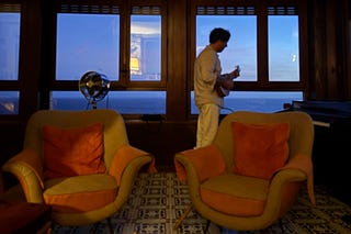 A mid-century suite overlooking the Pacific, seagulls competing with FOX News, and The Enquirer beside LIFE’s cinematic moon landing that never was...